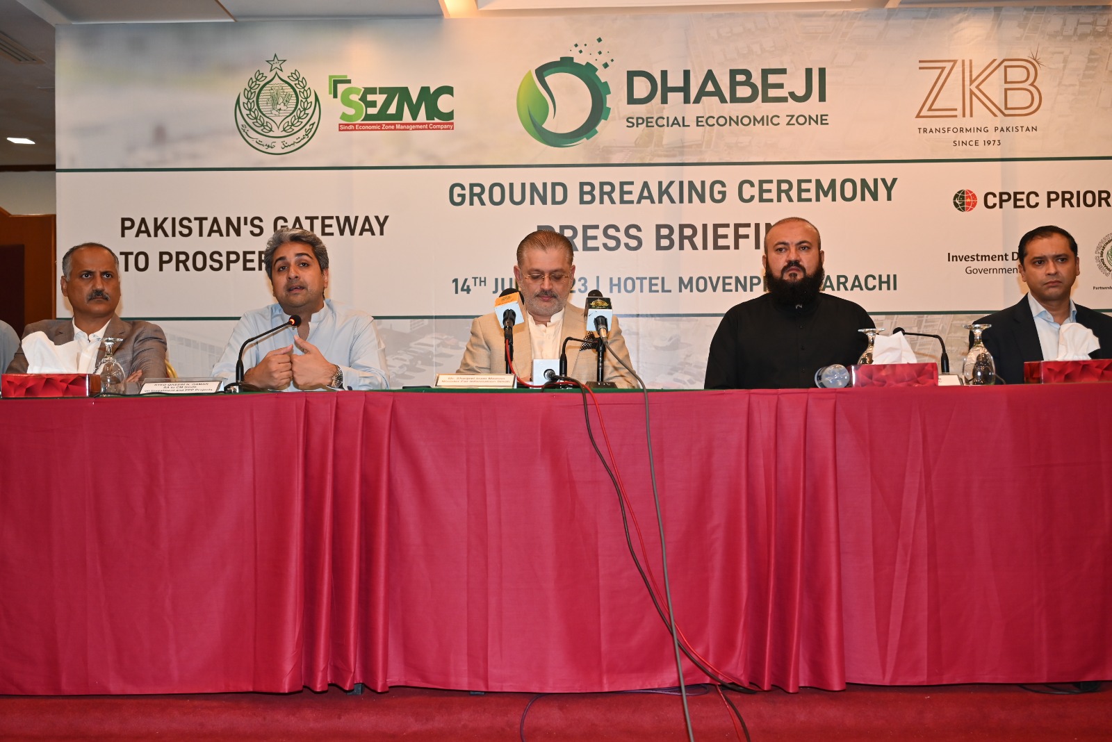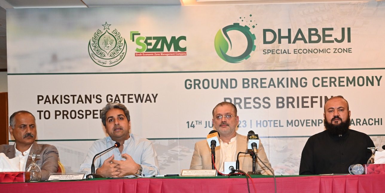 14th July 2023 : Press Briefing on Groundbreaking of Dhabeji SEZ Held at Movenpick Hotel, Karachi 14th July 2023 : Press Briefing on Groundbreaking of Dhabeji Special Economic Zone Held at Movenpick Hotel, Karachi You Might Also Like Khairpur SEZ, Pakistan 1st SEZ, to Catapult Industrial growth in Khairpur Area: Enterprises Forge Ahead Despite Economic Challenges! A progress review meeting was held under the Chair of CEO SEZMC with the enterprises of Khairpur SEZ February 14, 2024 Briefing session on Dhabeji SEZ with Mr. Khalid Mansoor SAPM on CPEC Affairs. Mr. Qassim N. Qamar, Special Assistant to CM, Secretary Investment, GoS, CEO SEZMC and others attended. October 11, 2021 A high-powered Chinese Business Group visited the Dhabeji Special Economic Zone – DSEZ today as part of collaboration to drive economic growth, job creation, and industrialization under #CPEC. December 12, 2024