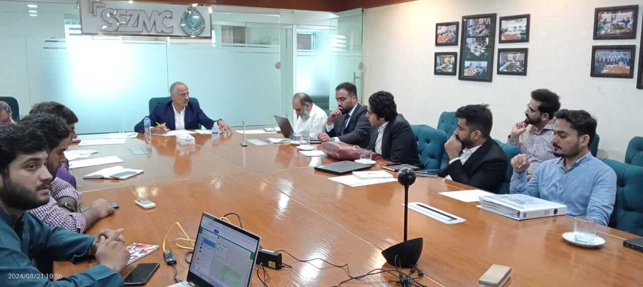 Progress review meeting held today for New Industrial Enclaves in Hyderabad, Sukkur and SBA was chaired by the CEO SEZMC and was attended by consortium members Exponent Engg, HMCO and A.F Ferguson & Co., Chartered Accountants You Might Also Like Progress Review Meeting of New Industrial Enclaves in Hyderabad, Sukkur and SBA was held on 8th January 2025. The meeting attended by consortium members Haidermota & CO & Exponent Eng January 9, 2025 11th April 2023: Progress review meeting of Project Dhabeji Industrial Zone held in meeting room of SEZMC April 12, 2023 On October 1st, 2024, the Progress Review Meeting for all SEZMC projects was held, chaired by the CTO of SEZMC. During the meeting, progress on all projects was discussed and reviewed. October 1, 2024
