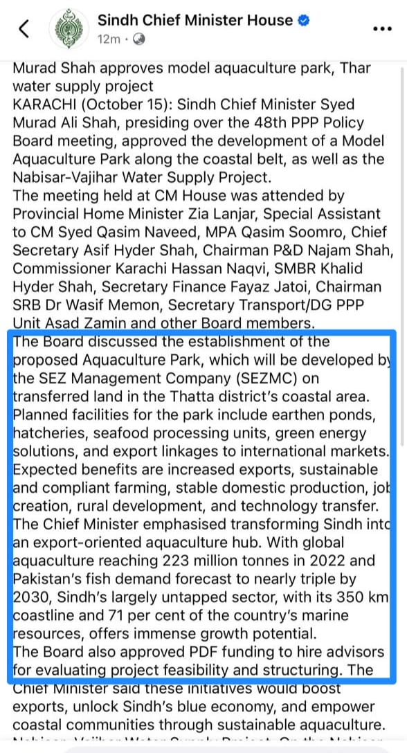 The proposed Aquaculture Park in Thatta, approved under the PPP Policy Board, Government of Sindh, represents a transformative step toward unlocking the immense potential of Sindh’s coastal belt.
